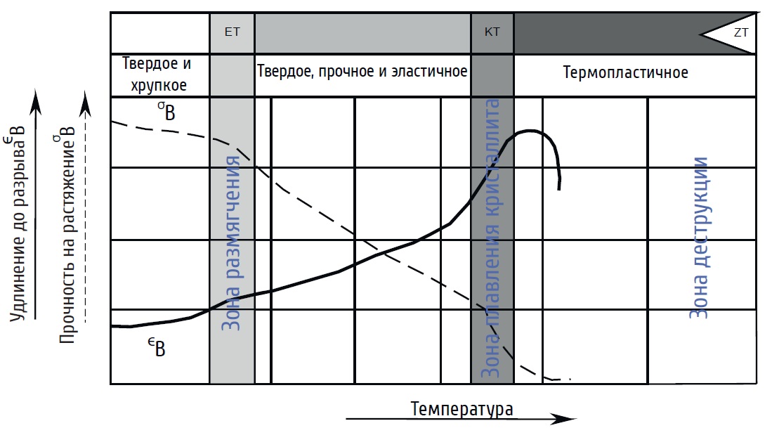 Графически эту зависимость можно выразить в виде т.н. термомеханической кривой (см. диаграмму), на которой показываются значения прочности и модуля упругости материала в зависимости от температуры нагрева материала: