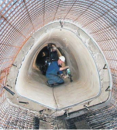В этом случае применяют либо уже готовые сегменты бетонных труб с установленной облицовкой, либо внутрь коллектора устанавливаю сегменты облицовки, шириной до 3 м, которые свариваются между собой. Для сохранения формы облицовки устанавливают либо внутреннюю опалубку, либо надувные маты, после чего в промежуток между стенками коллектора и стенками облицовки заливается бетон.